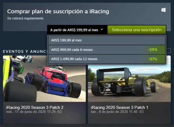 Tengo que aclarar que todo lo que verás a continuación solamente sirve si creas tu cuenta desde Steam desde el principio, si ya tienes tu cuenta en iRacing podrías vincular la cuenta con Steam pero seguirás pagando todo desde la página web. Además, solo sirve para ahorrar con las suscripciones, para comprar contenido como coches o autos si debes hacerlo por la página web y te cuesta lo mismo que a todo el mundo.