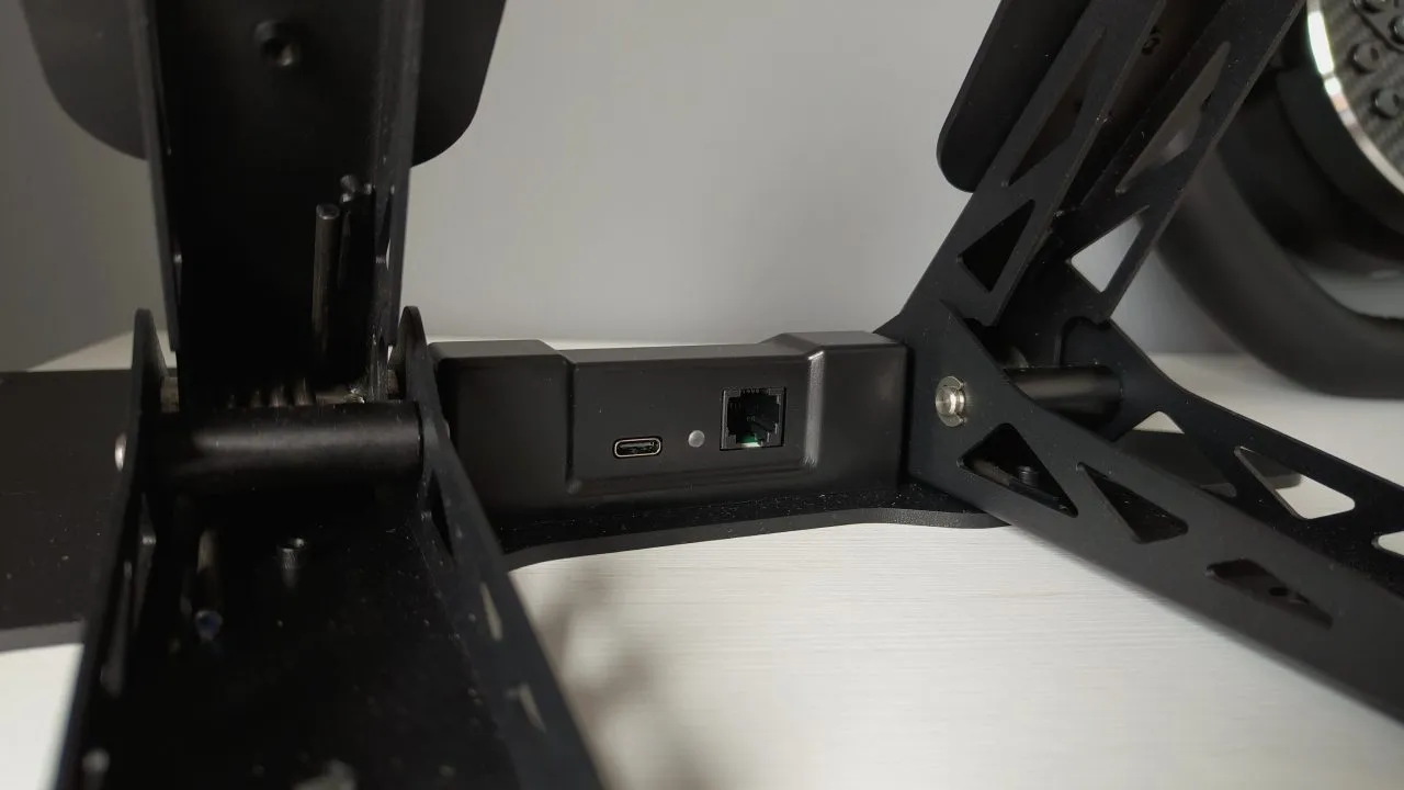 En la parte trasera de la base – aro, está el botón de encendido, próximo a él un pequeño botón de «reset» y las diferentes conexiones: FAN para el pequeño ventilador, USB para conectarlo al PC y DC INPUT donde se alimentará la base y dos pequeños USB Tipo-C para conectar los pedales y el freno de mano o cambio de marcha si tuviésemos.