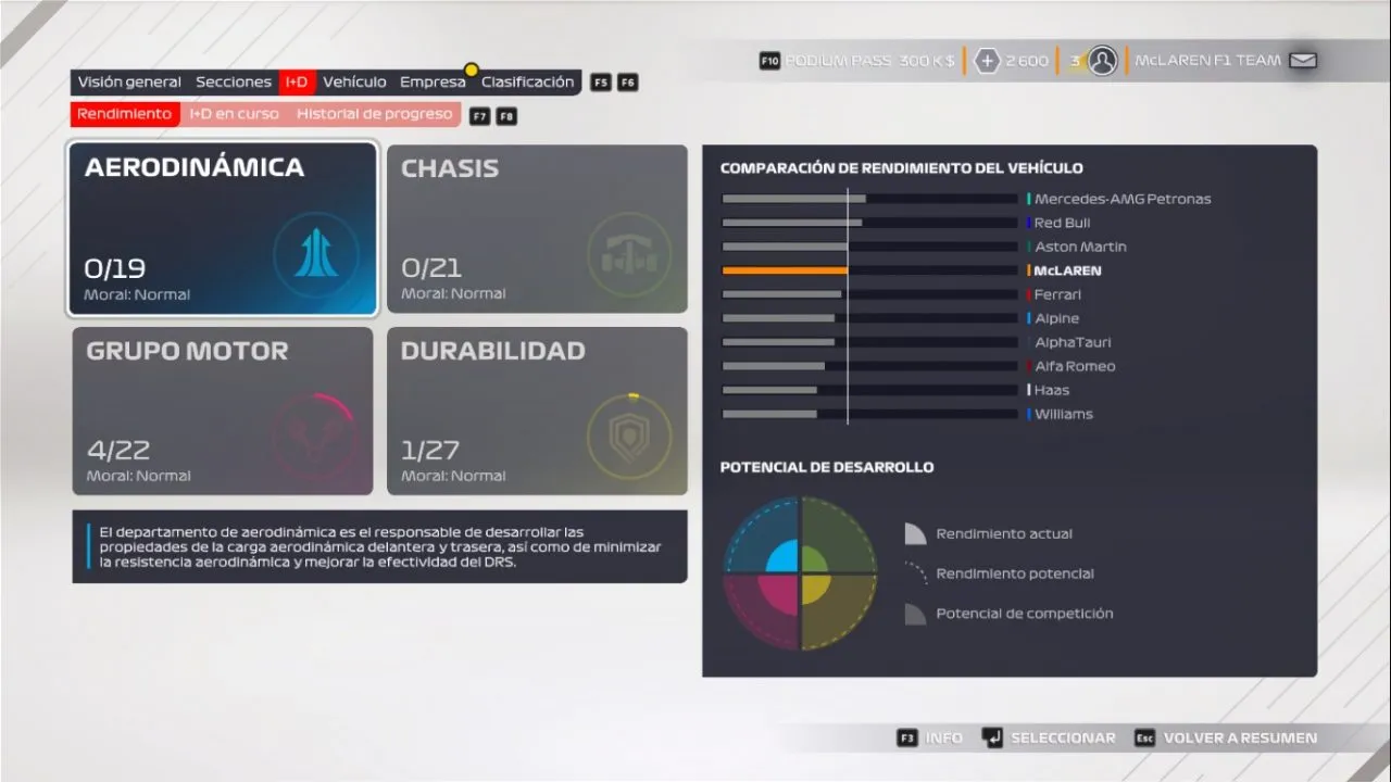 En ambos modos carrera tendremos que desarrollar el coche con los puntos de recurso que vayamos obteniendo tanto en las prácticas como en eventos externos a las carreras. Sin embargo, aquí es donde tenemos uno de los cambios más dramáticos en todo el juego. El desarrollo de los coches ya no es en la forma de «árbol» que teníamos en las antiguas entregas, sino que se ha simplificado mucho más y se ha hecho más «lineal». Sin embargo, siguen existiendo las 4 ramas de desarrollo: chasis, aerodinámica, motor y durabilidad, por lo que de igual manera podemos ir dando prioridad a que áreas del coche desarrollar.