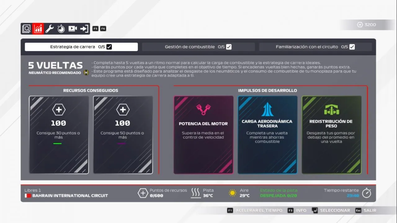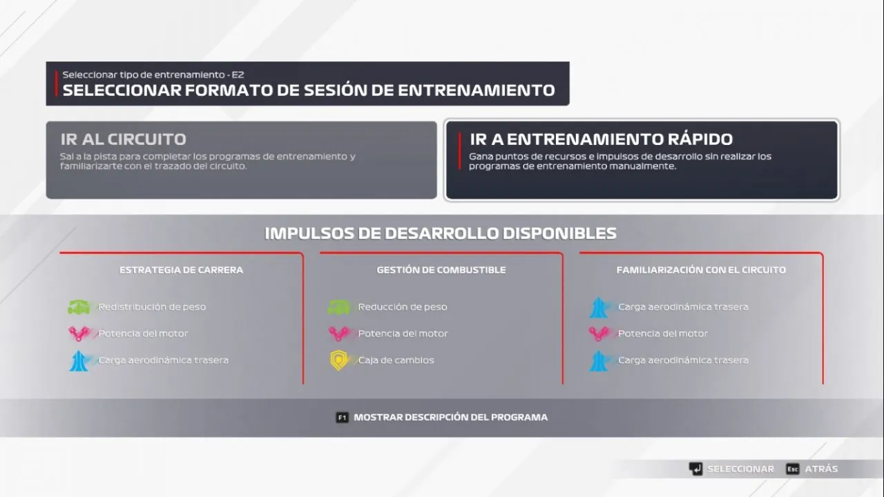 Otro de los grandes cambios que han sufrido los modos carrera, es en los planes de entrenamiento de las prácticas de los Grandes Premios. Anteriormente, en cada práctica teníamos 6 planes diferentes que debíamos completar para poder obtener puntos de recursos para desarrollar los coches: familiarización del circuito, gestión de neumáticos, gestión de combustible, gestión de ERS, ritmo de clasificación y estrategia de carrera. Todos tenían un objetivo básico y uno extra, en el que si lográbamos los dos nos daba mayores puntos de recursos.