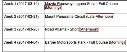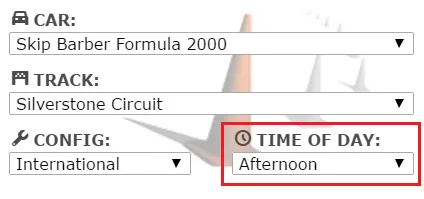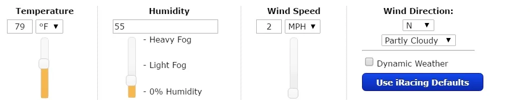 Importante: La comunidad de iRacing utiliza una configuración por defecto (Use iRacing Defaults) para realizar vueltas rápidas y poder compararse con otros simracers. Es la única manera de poder comparar vueltas, ya que cambiando cualquier factor alterará fácilmente el tiempo de vuelta. Es importante consultar el calendario, ya que algunas series se corren en un horario concreto (aunque luego los factores pueden variar dependiendo de la sesión).