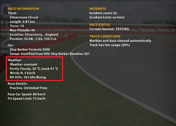- Presión atmosférica (101 kPa Rising): Factor afectado por la altitud de la pista, por lo que una pista del nivel del mar será más rápida que una pista a gran altitud debido al aumento del aire.