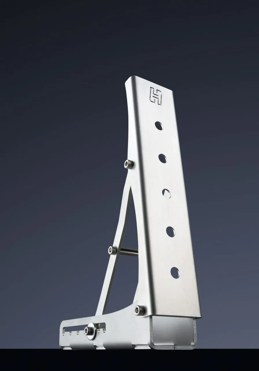 El diseño combina perfectamente con todos nuestros conjuntos de pedales Sprint y Ultimate+ gracias a los materiales y colores, y por supuesto, el icono de la ‘H’ de Heusinkveld cortado con láser.