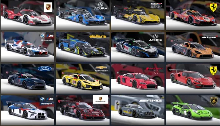- GTP & HYP (Hypercar): prototipos de última generación como Acura ARX‑06, BMW M Hybrid V8, Cadillac V‑Series.R o Porsche 963.