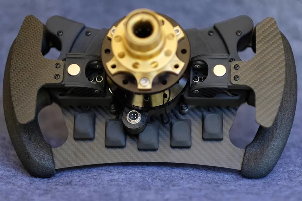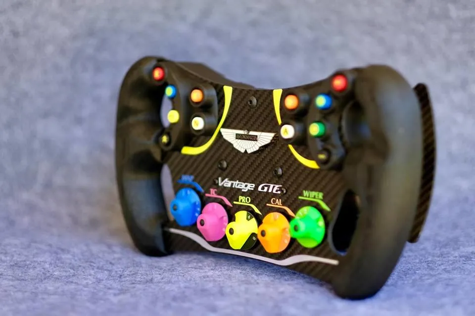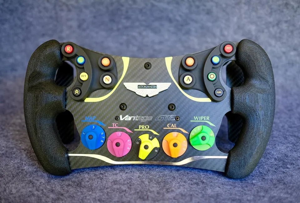 OSR (Open Sim Racing), nos descubre una réplica del volante Aston Martin realizado con fibra de carbono con levas magnéticas y un conjunto de 12 botones y 5 rotary.