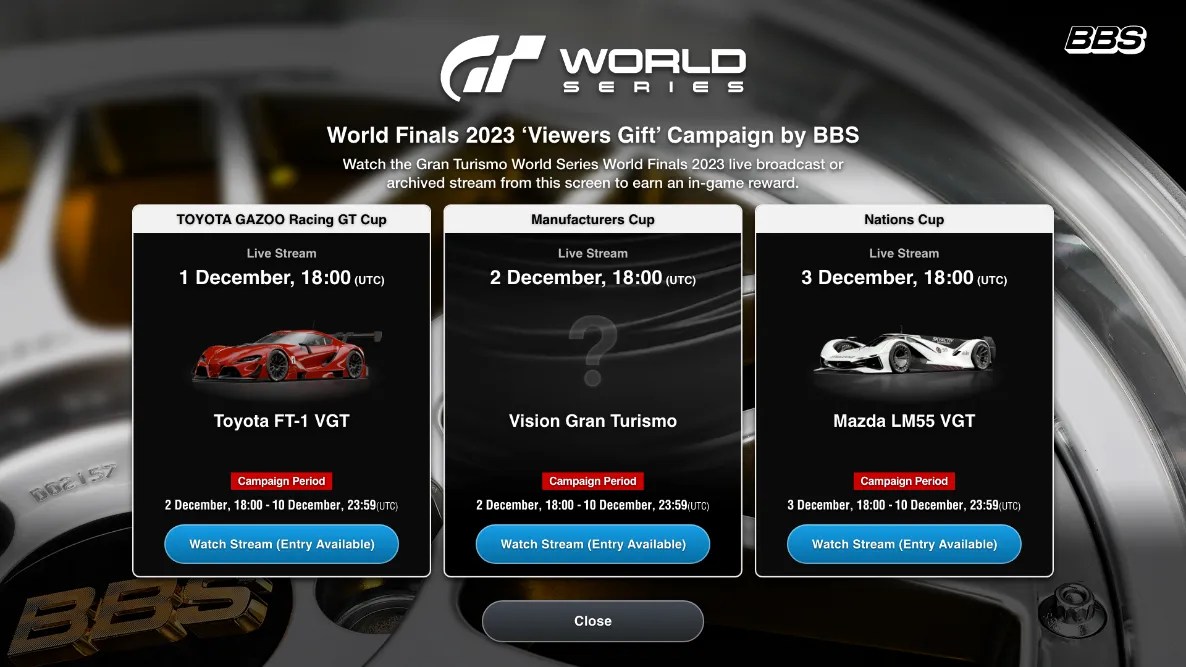 En esta campaña, los jugadores pueden ganar créditos del juego si adivinan los equipos ganadores de la GT Cup de TOYOTA GAZOO Racing (GT Cup de TGR), la Manufacturers Cup y la Nations Cup en la Final mundial. Se entregarán 1 000 000 de créditos por acertar un ganador y un total de 3 000 000 de créditos para quienes adivinen los ganadores de los tres torneos.
