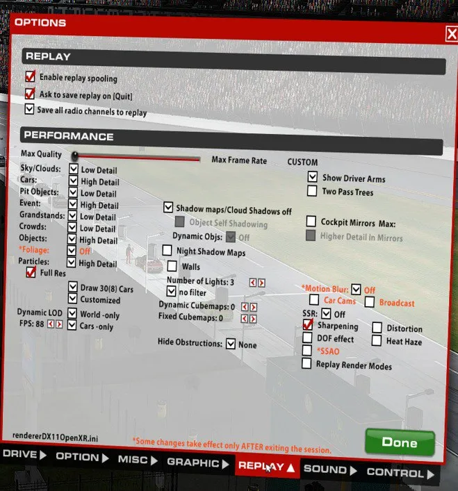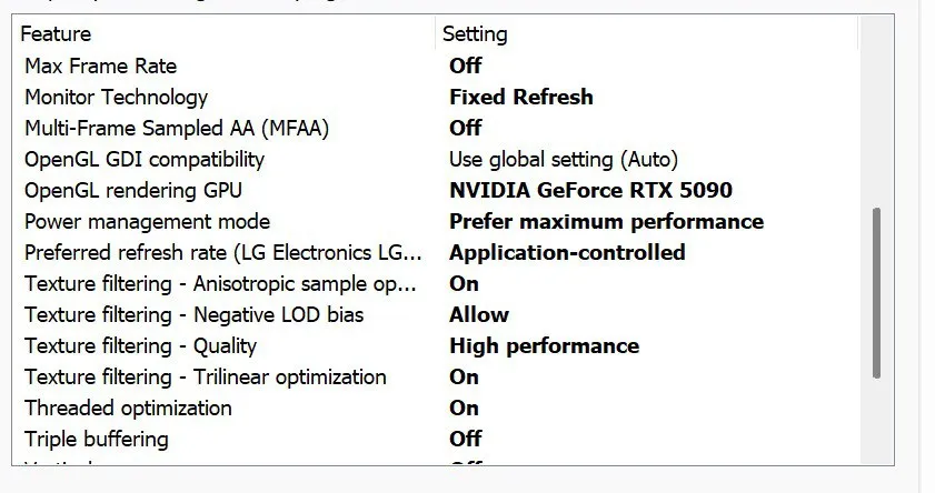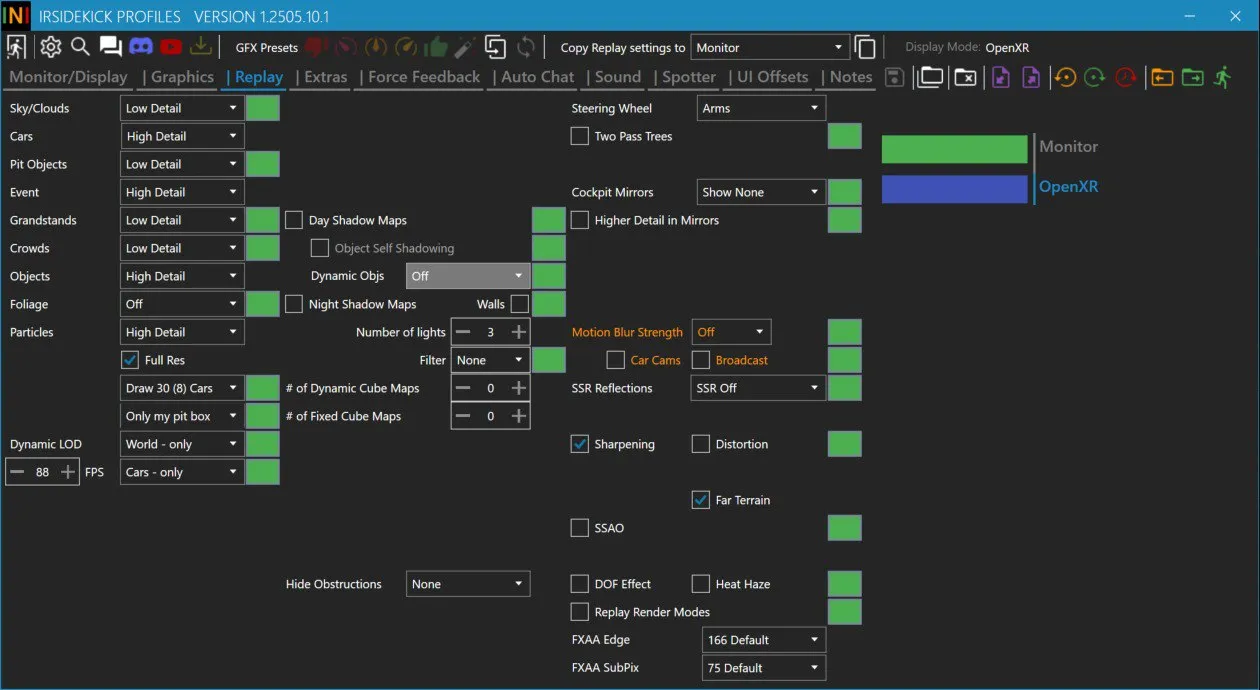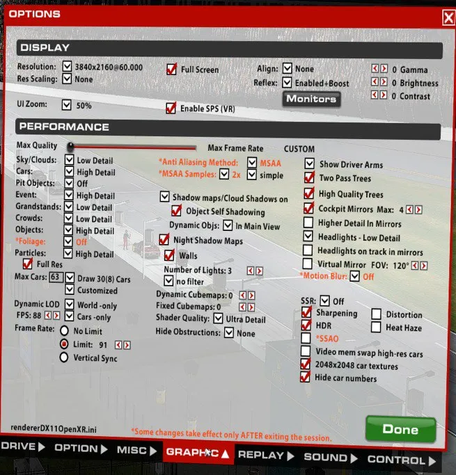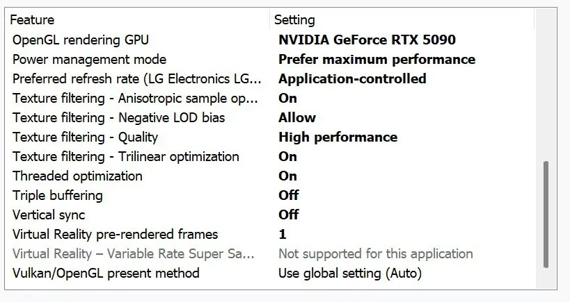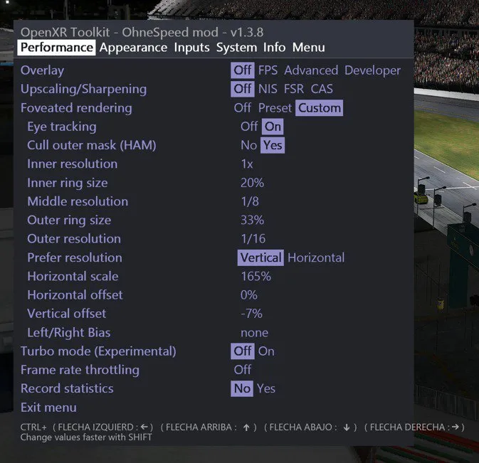 | Render foveado (DFR) | Imprescindible incluso con una RTX 5090 para mantener rendimiento. Se recomienda usarlo con configuración personalizada para simuladores como iRacing. |