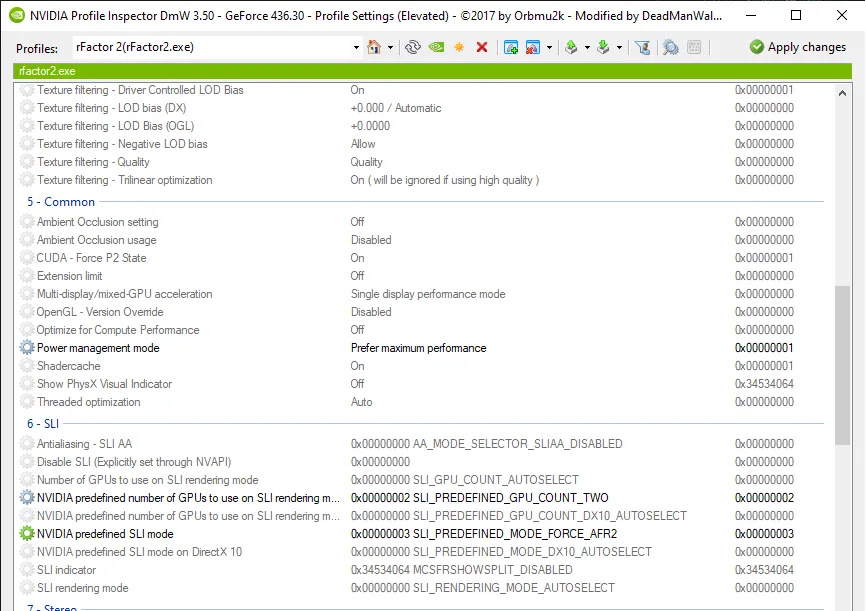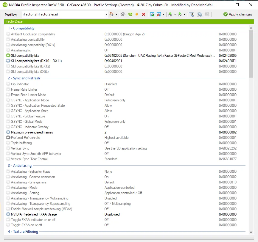 Por suerte la comunidad de rFactor 2 ha conseguido dar, a base de lo que seguramente hayan sido decenas de horas de pruebas, con la configuración correcta para SLI, y han sido lo suficientemente amables de compartirla con la web. Para cambiar la configuración SLI debemos bajar un programa llamado Nvidia Inspector. Los usuarios de Automobilista lo conocerán porque es la única forma de aplicar antialiasing correctamente al simulador desde hace un par de años. Una vez descargado y abierto, deberemos cargar el perfil de rFactor 2 e introducir los siguientes cambios: