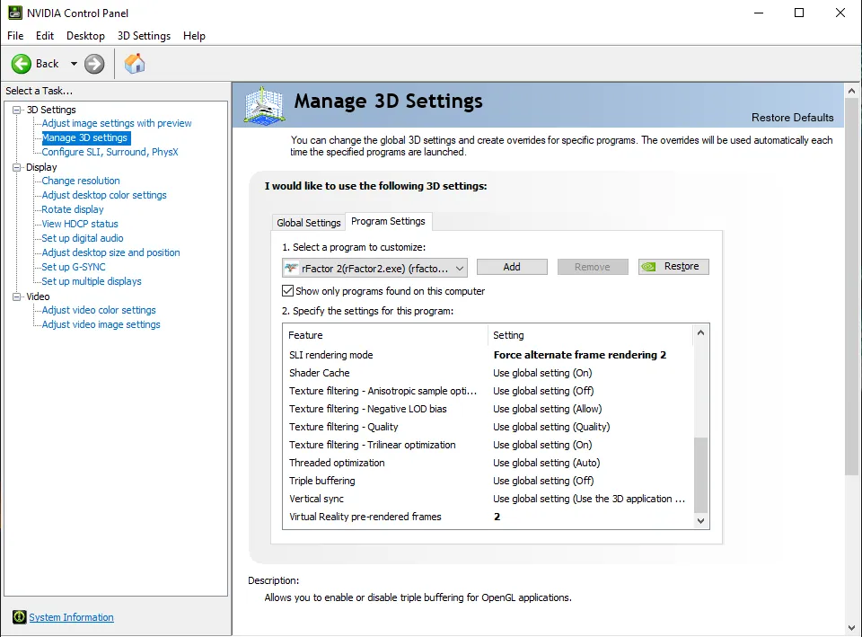 Este último ajuste, aunque extraño, es el que fuerza a la segunda tarjeta a funcionar a tope también. No queda claro si es un problema del driver de Nvidia o de rFactor 2, pero Virtual reality pre-rendered frames debe estar en 2 para poder usar SLI en todo su potencial. También se puede cambiar desde el Panel de Control de Nvidia si lo preferís. Debería de quedaros algo así: